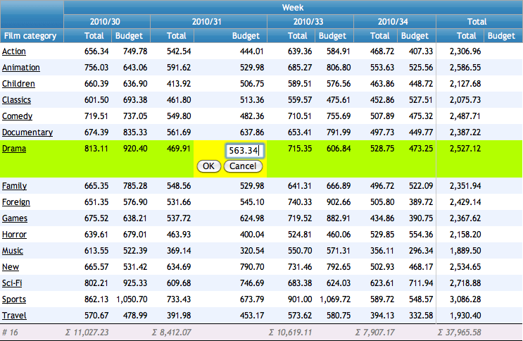 The following example demonstrates in-place editing within a crosstab report. The Budget column is configured for editing via the sp_DBR_update_crosstable procedure.