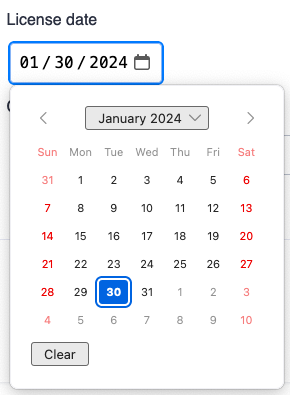 Creates a date input field. The 'required' option makes the field mandatory. -