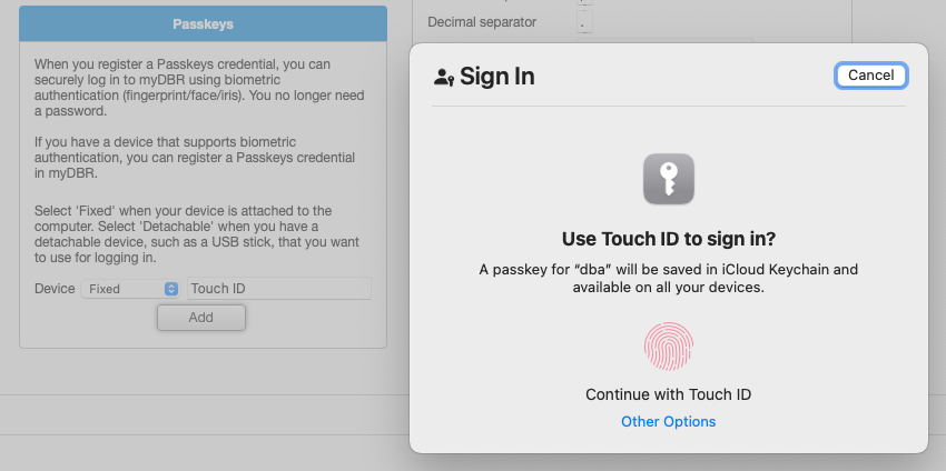 With Passkeys, users can log in without a password, leveraging biometric authentication. When using Passkeys, enabling the 'Remember Me' checkbox on the login screen stores the username in the browser. This prompts myDBR to initiate biometric authentication as soon as the user accesses the login screen.