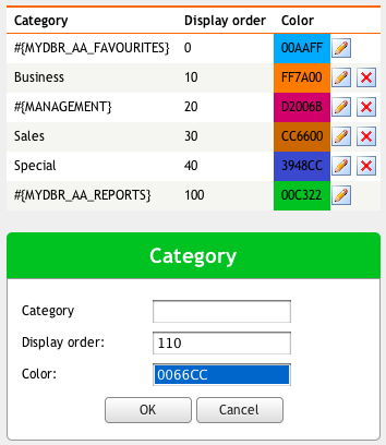 Report categories provide a means to organize reports within the report folder into different categories. Each category includes a name (title), an optional display order (number), and a designated color.