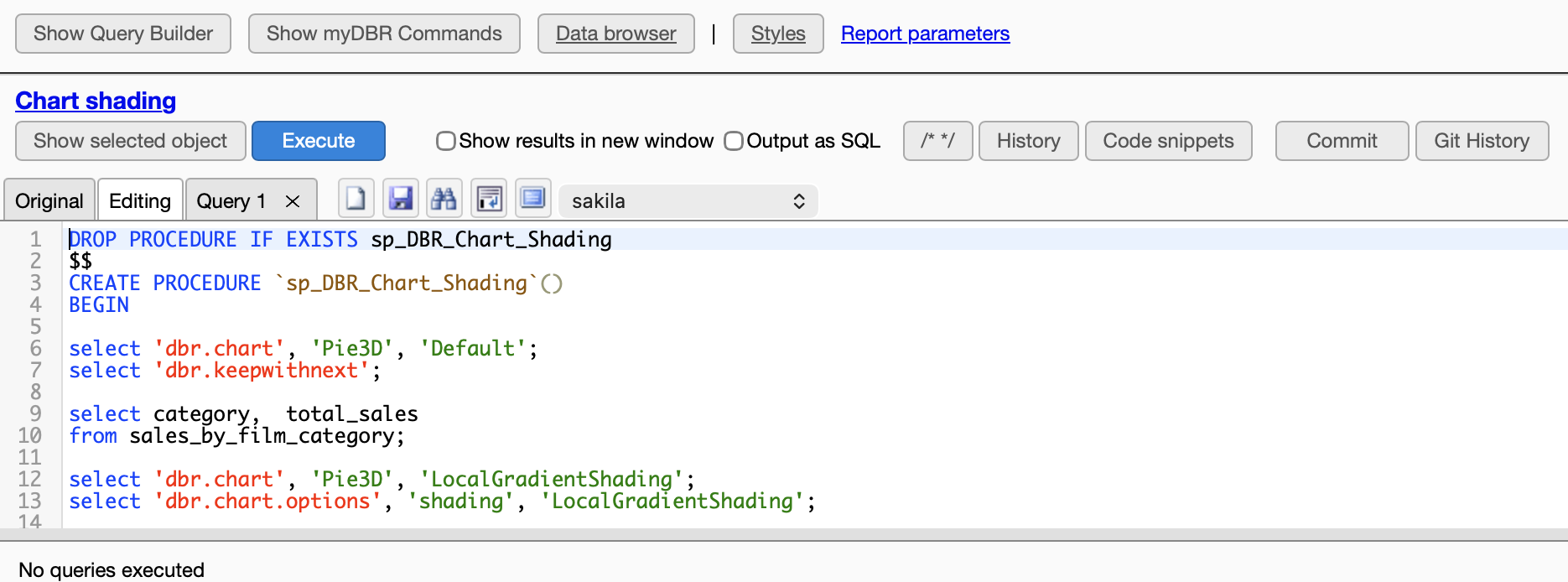 The myDBR SQL Editor is a built-in editor for accessing reports and other database objects. You can use it to create reports, query or update data, or run any SQL command against the selected database.