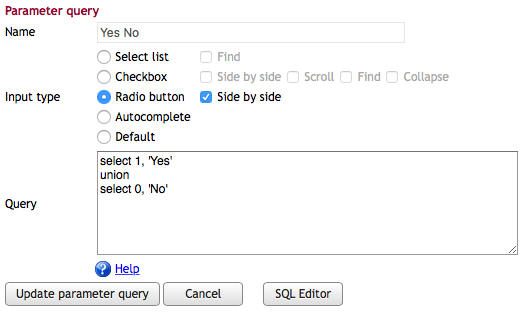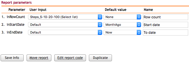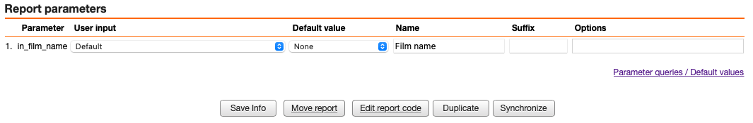For example, a statistics report might default to showing data for the past month. You can define a default query in Admin -> Parameter queries: